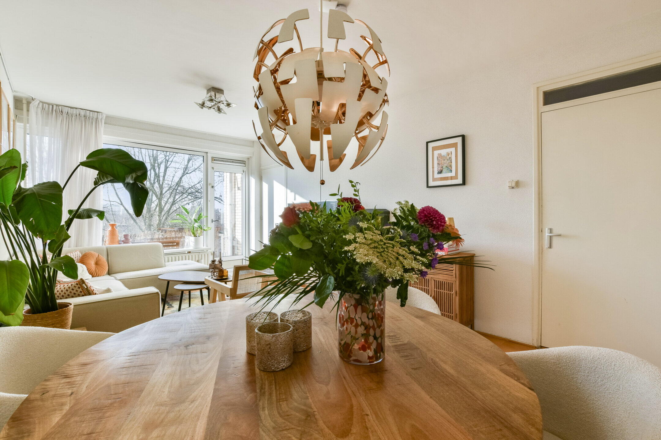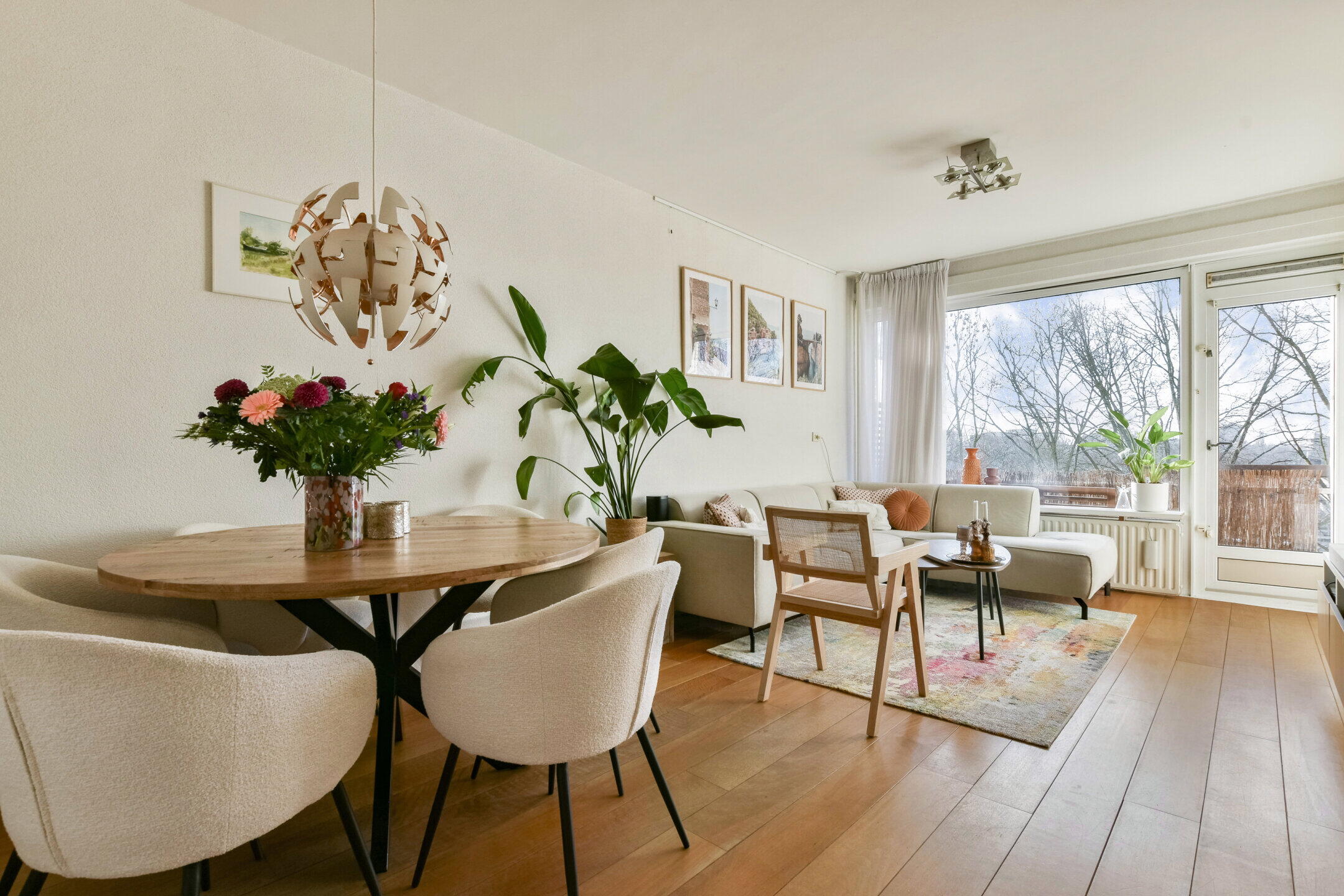 The living room is spacious and very light thanks to the large windows across the full width. From here, you have an unobstructed view of the green surroundings, which creates a pleasant feeling of space and privacy. There is enough space for both a spacious sitting area and a dining table. From the living room, you have access to the balcony at the rear, conveniently located on the sunny south side, where you can enjoy the sun and the view.